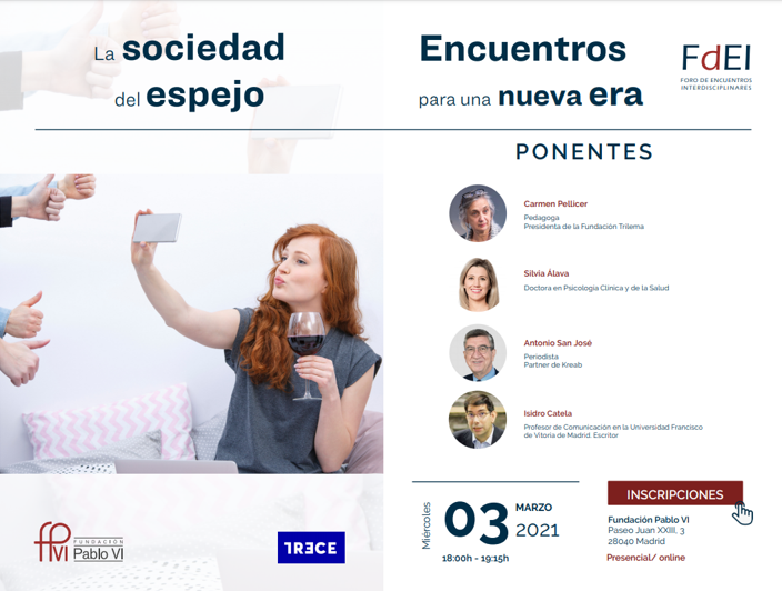 ¿Cuáles son los riesgos de vivir permanentemente pendientes de nuestro yo virtual? ¿Nos hemos vuelto más narcisistas y solitarios? ¿Cómo educar a los niños y los jóvenes para no caer en la adicción a las redes? ¿Acabaremos mirando el mundo solo a través de una pantalla? Con el título “La Sociedad del Espejo” abordaremos este asunto desde la psicología, la pedagogía, los medios de comunicación, la filosofía y la economía, con Carmen Pellicer, pedagoga y presidenta de la Fundación Trilema; Silvia Álava, doctora en Psicología Clínica y de la Salud; y Antonio San José, periodista y socio de la consultora Kreab.