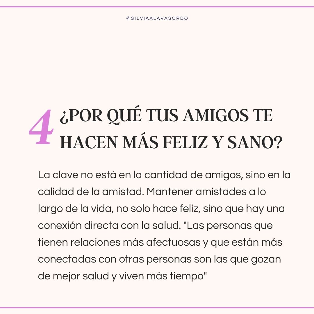 La clave no está en la cantidad de amigos, sino en la calidad de la amistad. Mantener amistades a lo largo de la vida, no solo hace feliz, sino que hay una conexión directa con la salud. «Las personas que tienen relaciones más afectuosas y que están más conectadas con otras personas son las que gozan de mejor salud y viven más tiempo»